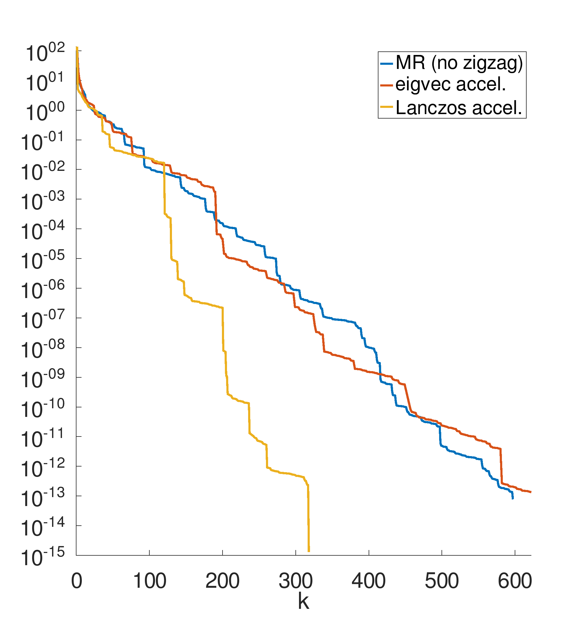 Electronic structure calculations are sources of infinitely many problems dealing with numerical linear algebra. Recently, I got interested with collaborators on acceleration techniques for gradient-type methods. The idea is that standard optimal step gradient descent methods for high-dimensional problems often suffer from the strange zig-zag effect, where the residuals live in a two dimensional subspace. Avoiding this effect allows to significantly accelerated the convergence of these methods by exploiting their link with power methods and the alignment of the residual with eigendirections.